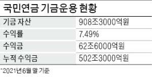 25일 국민연금 기금운용현황에 따르면 지난 6월 말 잠정 기준 기금 자산은 908조3000억원에 달했다. 투자 자산의 가치가 뛴 데다 연금 수입이 들어오면서 올 들어서만 74조5000억원 불어났다.
