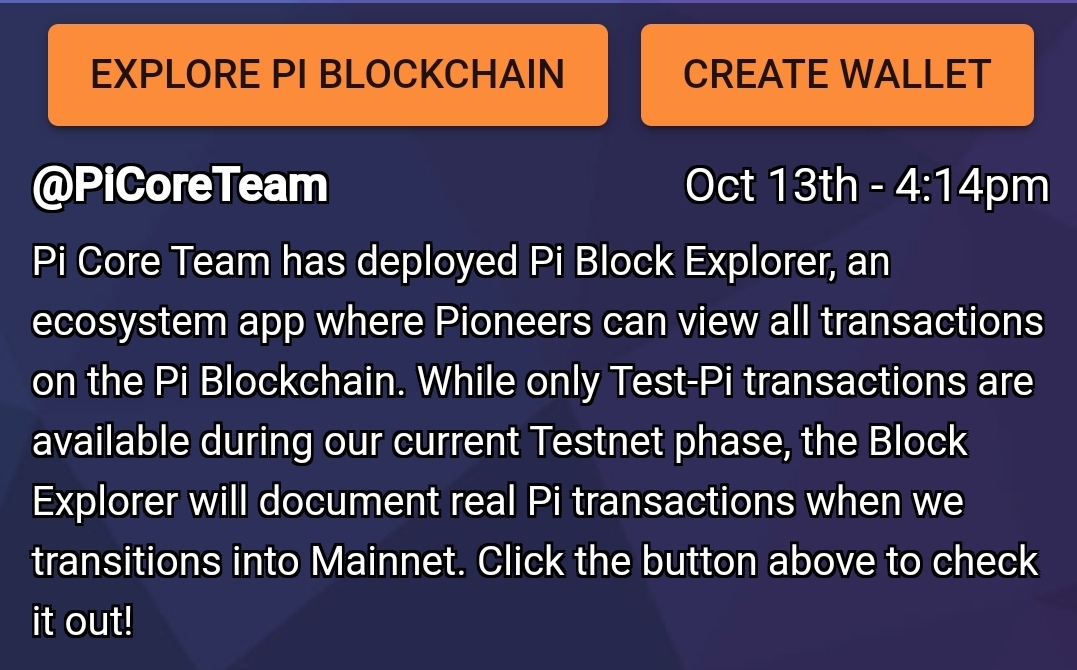10월 13일 파이코어팀은 파이 블록체인 익스플로러 (Pi Blockchain Explorer) 를 파이앱을 통해 공개했습니다.