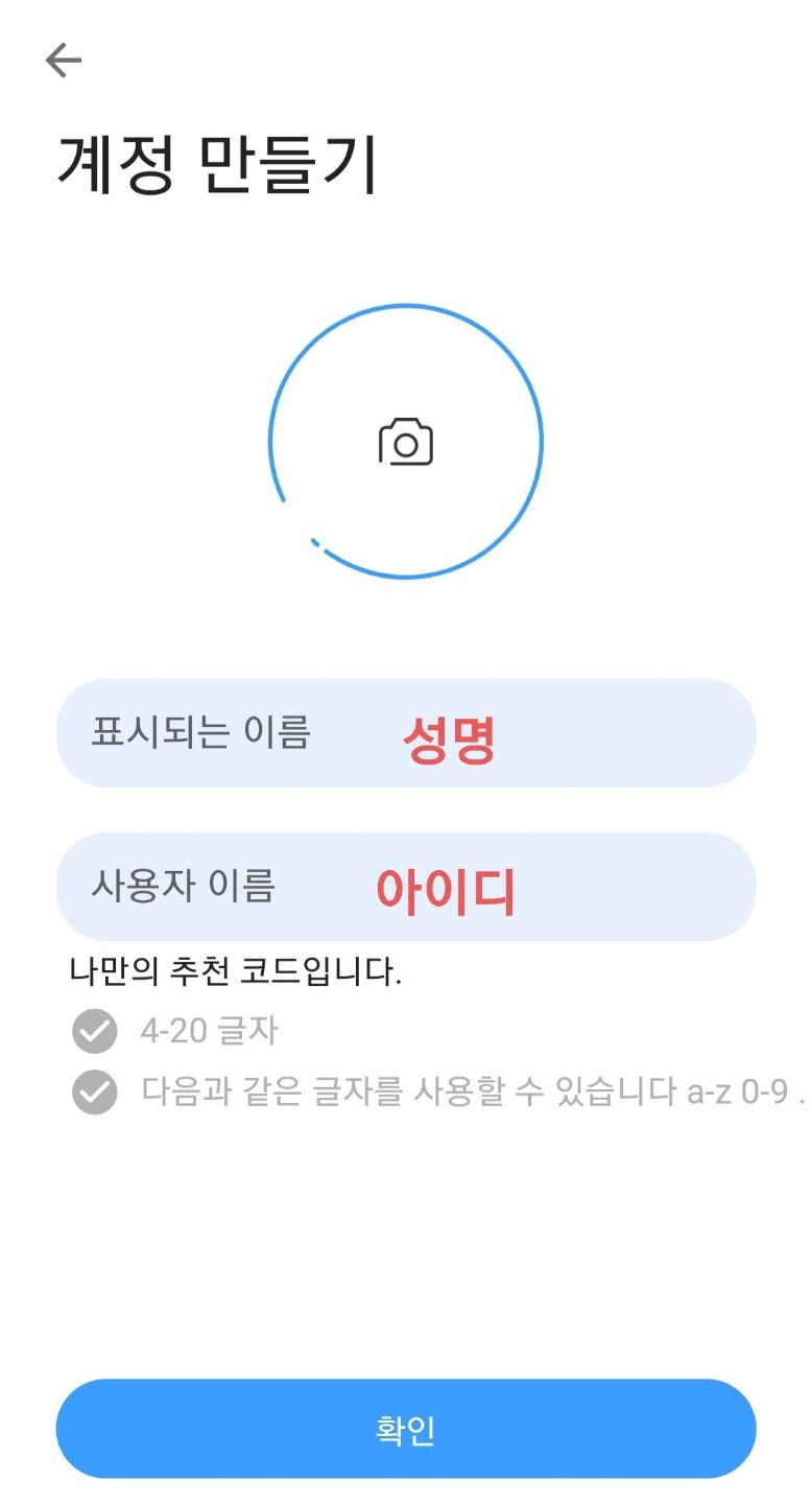 8. 본인 이름 (한글,영문 상관 없음) 과 본인이 사용할 추천코드(ID)를 입력합니다.