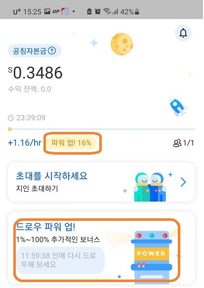 9. 이제 가입이 완료 되셨구요~ 우주선을 클릭하면 채굴은 시작됩니다.