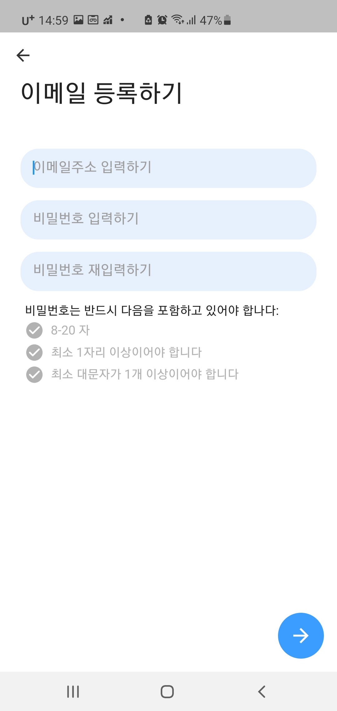4. 본인의 이메일 등록 및 앱 로그인시 필요한 비밀번호를 입력합니다.