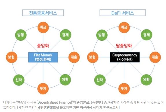 오픈소스 소프트웨어와 분산된 네트워크를 통해 정부나 기업 등 중앙기관의 통제를 받지 않는 금융 생태계를 말하며, 디파이는 금융 시스템에서 중개자 역할을 하는 은행, 증권사, 카드사 등이 필요하지 않아 은행 계좌나 신용카드가 없어도 인터넷 연결만 가능하면 블록체인 기술로 예금은 물론이고 결제, 보험, 투자 등의 다양한 금융 서비스를 이용할 수 있다. 이는 기존 금융 시스템을 블록체인 기반의 서비스나 암호화폐로 대체하려는 움직임으로 자산 토큰화(tokenization), 스테이블 코인(stable coin, 비변동성 암호화폐), 탈중앙화 거래소(DEX, 중개인이 없이 자산을 P2P 방식으로 관리하는 분산화된 자산 거래소) 등이 대표적인 디파이 서비스 모델로 꼽힌다.