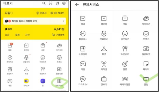 우선, 카카오톡 화면 맨우측 -> 더보기(***) -> 전체서비스 -> 클립 순으로 하시면 됩니다.