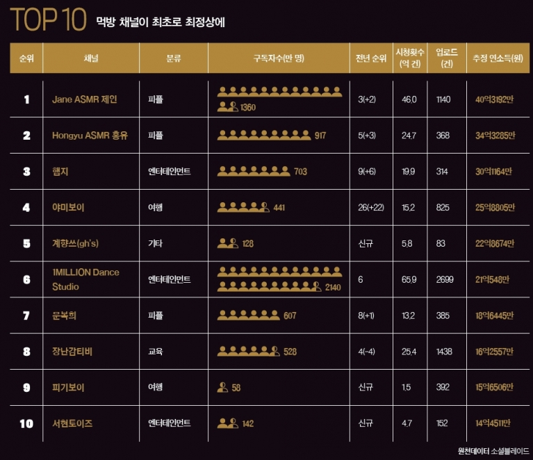 1위를 차지한 ‘Jane ASMR 제인’은 ASMR 먹방이다. 추정 연소득은 40억3192만원으로 지난해 3위에서 최정상으로 점프했다. ‘Jane ASMR 제인’은 항상 분홍색 립스틱을 바른 입만 보이는 먹방으로 화려하고 자극적인 디저트 음식을 먹는다. 일반적으로 다른 유튜버들이 브이로그 등 다양한 콘텐트를 다루는 데 비해 ‘Jane ASMR 제인’은 오로지 ASMR 먹방만 찍는다. ‘레인보우 크레이프 케이크, 너드 로프젤리, 먹는 숟가락 먹방’ 편은 최다 조회수 영상으로 약 2억 회를 기록했다. 2020년 무렵 해외에서 크게 알려지면서 구독자의 상당수가 외국인이다. 유튜버 개인은 얼굴조차 알려지지 않았다.