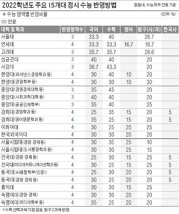 [2022학년도 대입 전략] 주요 15개대 정시 수능 반영방법