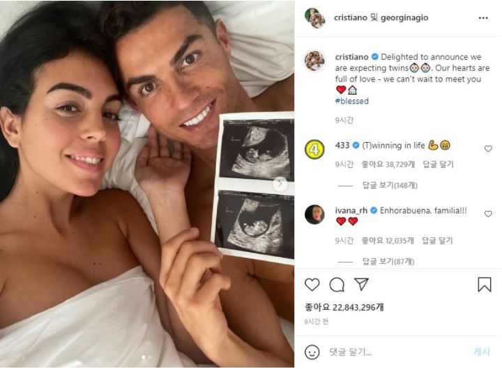 호날두는 29일. 자신의 사회관계망서비스(SNS)를 통해 연인인 조지나 로드리게스의 쌍둥이 임신 소식을 전했다.
