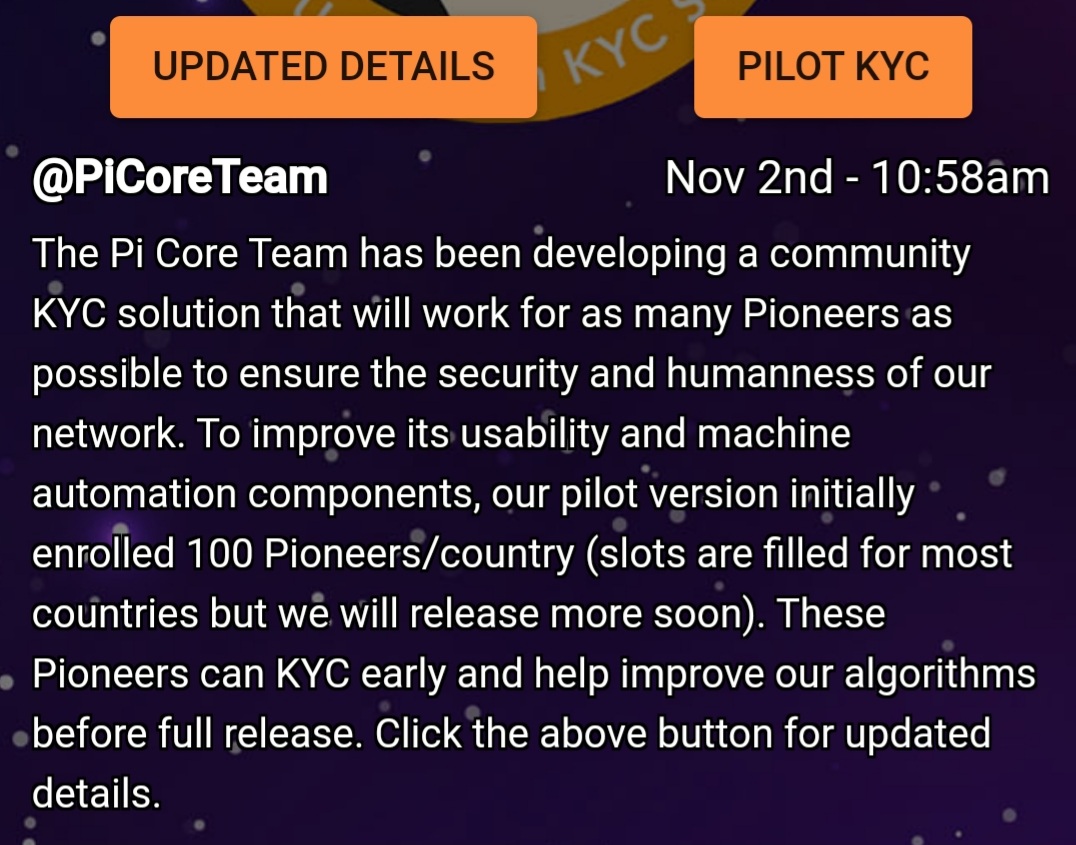 Pi Core 팀은 초기에 국가당 100명의 개척자를 등록할 파일럿 KYC 솔루션을 개발했습니다. 이 개척자들은 조기에 KYC를 할 수 있는 기회가 있고 우리의 솔루션이 메인넷 이전에 가능한 한 많은 개척자들에게 적용될 수 있도록 앱의 알고리즘을 개선하는 데 도움이 됩니다. 단기적으로는 국가당 초기 100명의 개척자보다 파일럿 버전에 대해 더 많은 KYC 슬롯을 점진적으로 출시할 것입니다.