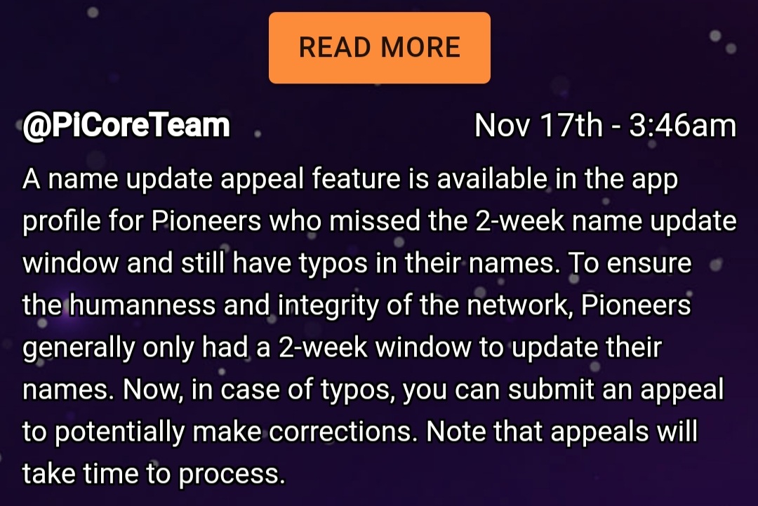 2주간의 이름 업데이트 기간을 놓쳤지만 여전히 이름에 오타가 있는 개척자를 위해 앱 프로필에서 이름 업데이트 이의 제기 기능을 사용할 수 있습니다. 네트워크의 인간성과 무결성을 보장하기 위해 Pioneers는 일반적으로 이름을 업데이트 할 수 있는 기간이 2주 밖에 없었습니다. 이제 오타가 있는 경우 이의를 제기하여 잠재적으로 수정할 수 있습니다. 이의 제기는 처리하는 데 시간이 걸립니다.