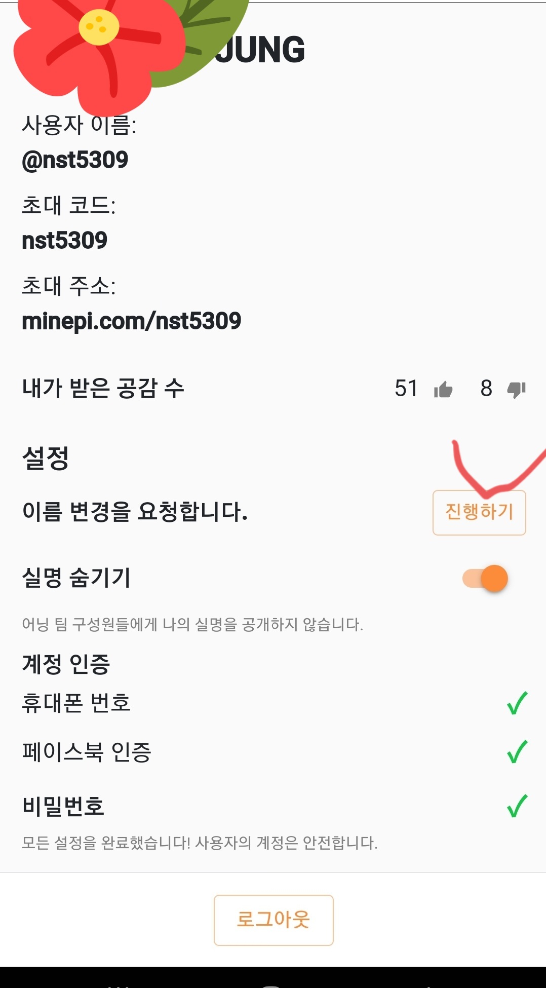 1) 파이앱 상 우측 상단 삼선(메뉴버튼]을 누르고 메뉴상 프로필에 들어가서 이름 변경을 요청합니다.의 '진행하기' 클릭