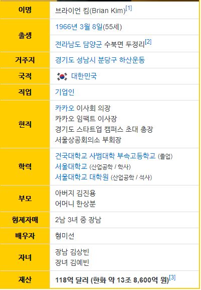 대한민국의 기업인. 카카오의 창업자이자 現 카카오 이사회 의장.