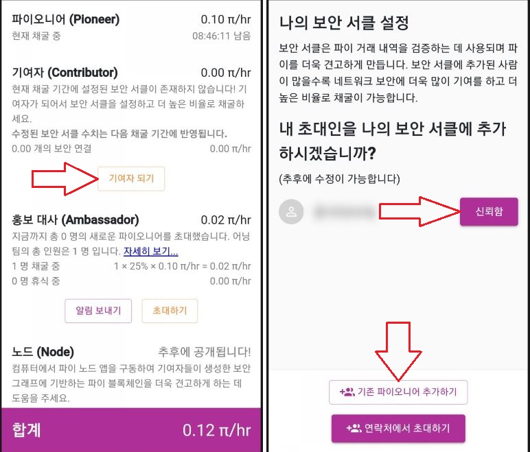 (나의 연락처에 저장되어 있는 사람들 중 파이코인을 채굴중인 사람을 찾아서 보안서클에 추가)