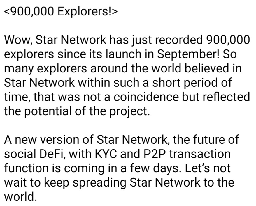 와우, Star Network는 9월에 출시된 이후로 900,000명의 탐험가를 기록했습니다! 전 세계의 수많은 탐험가들이 그 짧은 시간에 스타네트워크를 믿었던 것은 우연이 아니라 프로젝트의 잠재력을 반영한 것이었습니다.