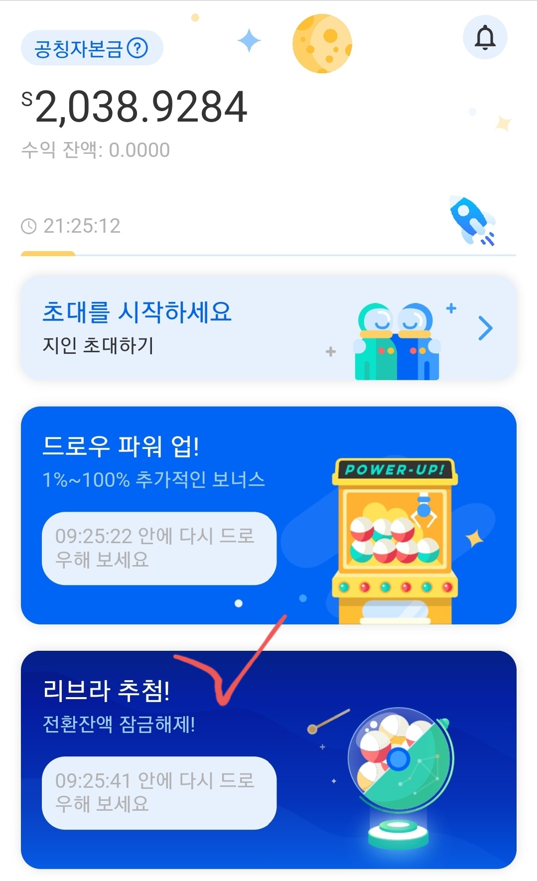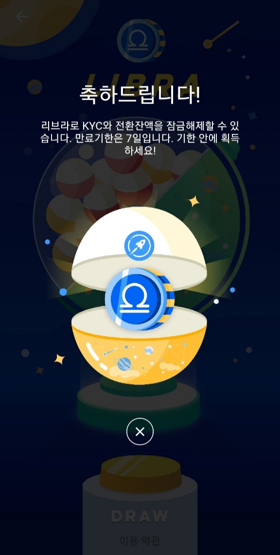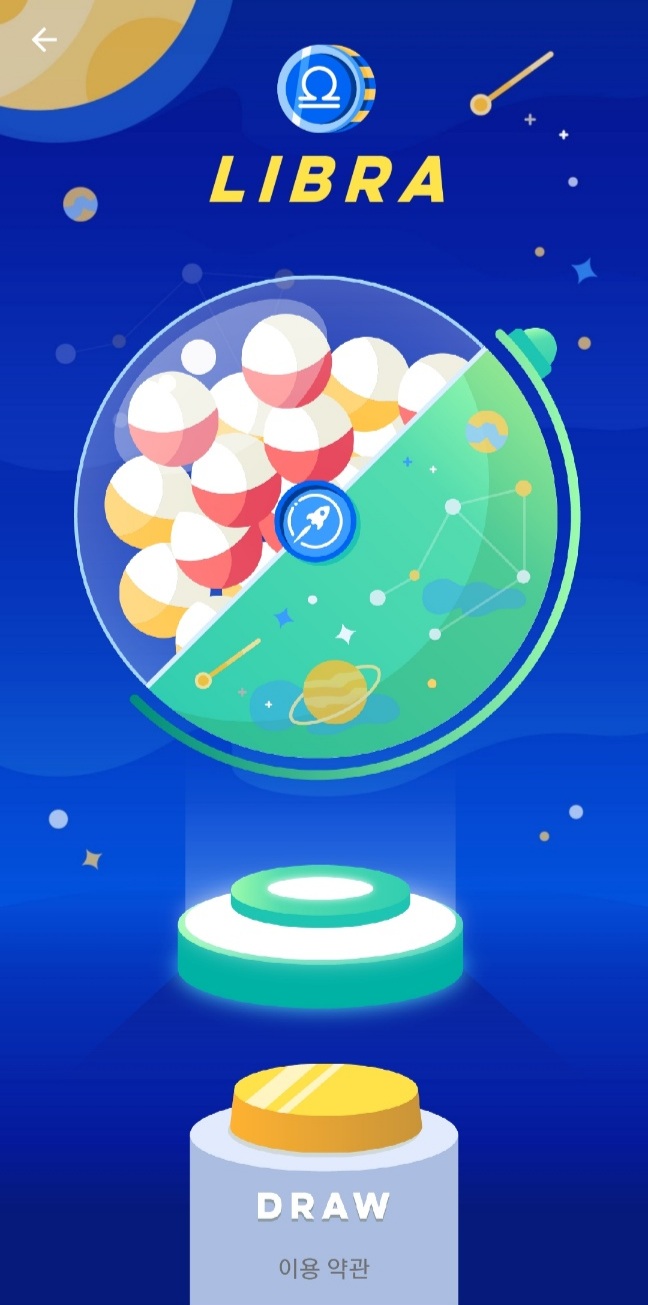앱의 홈 화면에서 "Libra 추첨"을 볼 수 있습니다. 파워업을 하는 것처럼 운을 시험해 보고 12시간마다 Libra를 성공적으로 그릴 수 있는지 확인할 수 있습니다. Libra를 성공적으로 그릴 수 있는 기회는 별 균형과 임의 요소에 따라 다릅니다. 자세한 내용은 백서 섹션 4.5를 참조하세요. Libra는 만료일이 7일인 NFT이므로 Libra를 뽑고 받은 후에는 Libra(KYC 잠금 해제 및 실현 잔액 잠금 해제)를 선택하거나 KYC를 완료한 경우 다른 사용자에게 줄 수 있습니다.