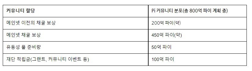 100억 파이는 미래에 비영리 재단에 의해 관리될 공동체 조직과 생태계 구축을 위해 예비될 것입니다. 대부분의 탈중앙화된 네트워크나 암호화폐는 탈중앙화되더라도 여전히 커뮤니티를 조직하고 미래의 생태계 방향을 정할 조직이 필요합니다. 미래파이재단은 (1) 개발자대회, 글로벌 온라인 행사, 지역공동체 회의 등 커뮤니티 행사를 주최·후원하고, (2) 지역사회와 생태계 구축을 위해 헌신하는 상근직원에 대한 급여 지급, (3) 커뮤니티의 의견수렴 및 피드백 수렴, (4) org미래의 커뮤니티 봉사를 구체화하고, (5) 브랜드 구축 및 네트워크의 평판 보호, (6) 정부, 전통 은행 및 전통 기업을 포함한 다른 비즈니스 실체와 상호 작용할 네트워크를 나타내거나, (7) Pi 커뮤니티와 생태계의 베티너티에 대한 모든 책임을 이행합니다. 또한 공익기반 Pi 생태계를 구축하기 위해 재단이 다양한 커뮤니티 개발자 프로그램을 설계, 조성, 추진하여 커뮤니티 개발자를 보조금, 육성, 파트너십 등의 형태로 지원할 예정입니다.