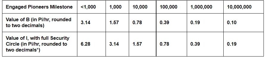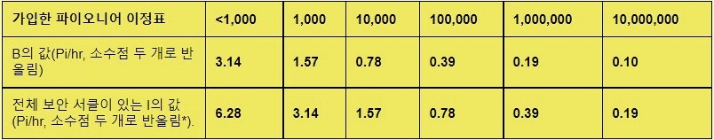 시스템 전체의 기본 채굴율 B는 3.1415926Pi/h로 시작해 1000 명의 파이오니어부터 시작해 참여 파이오니어의 네트워크 수가 10배씩 늘어날 때마다 반토막이 났습니다. 아래 나열된 것처럼 지금까지 5번의 반감기가 있었습니다.