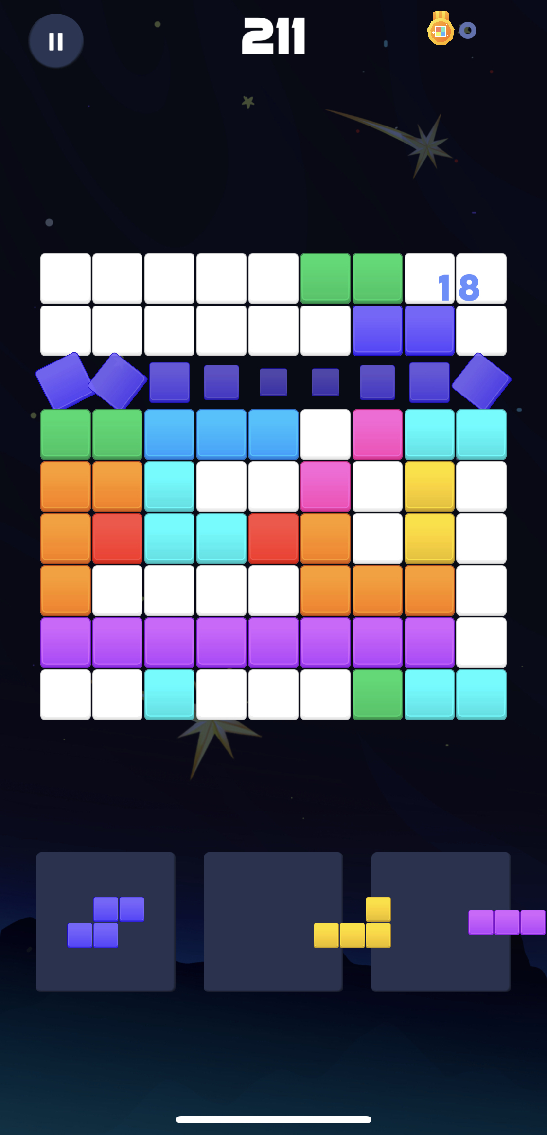 행 또는 열이 완전히 채워지면 퍼즐의 해당 열/행이 사라지고 다시 빈 상자가 됩니다. 먼저 열이나 행을 채우면 18점을 얻을 수 있습니다. 더 중요한 것은 게임을 계속할 수 있도록 새 빈 상자가 필요하다는 것입니다.