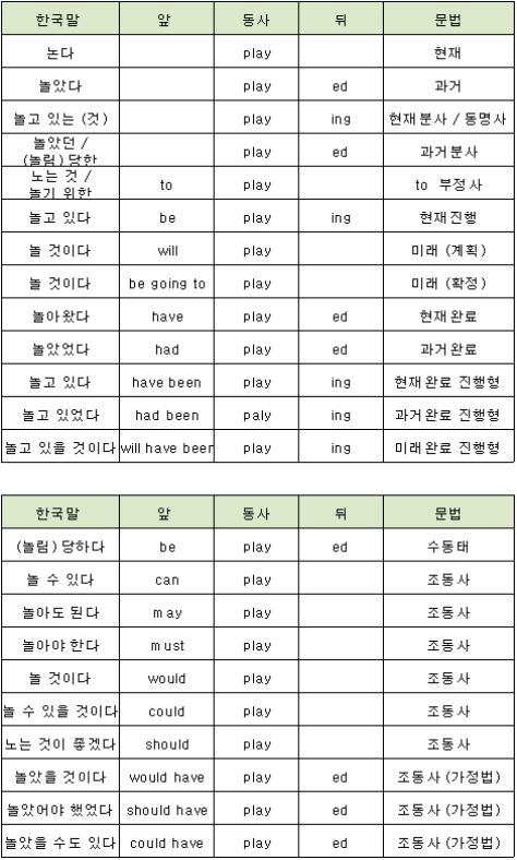 영문법의 기초가 될수 있는 동사 시제 및 문법을 표로 정리해 봤습니다.