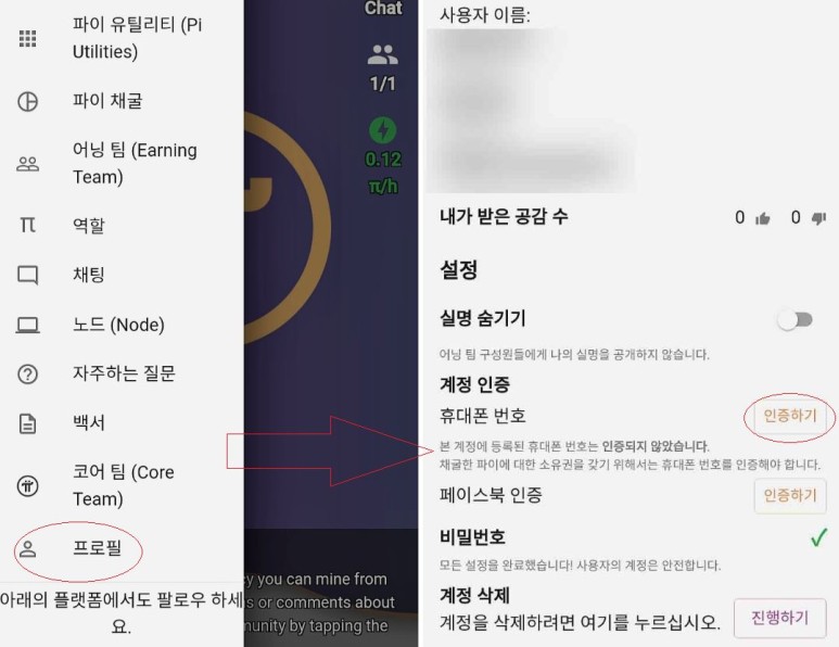 1. 메뉴 -> 프로필 -> 휴대폰번호 인증하기 클릭!